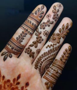 आजकल लड़कियाँ अपनी उंगलियों पर ही मेहंदी लगाना पसंद(like) करती हैं। ये देखने में भी बहुत स्टाइलिश(stylish) लगती हैं। ऐसे में आप इस तरह के डिज़ाइन का चुनाव कर सकती हैं।